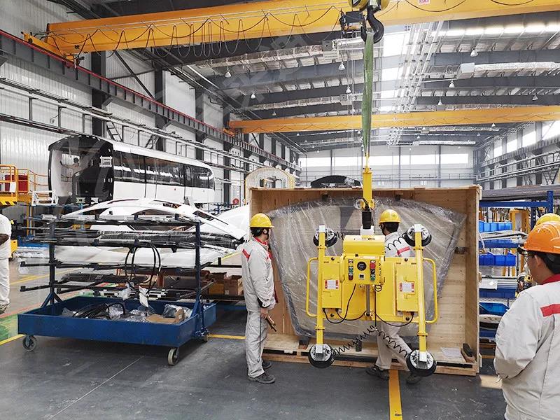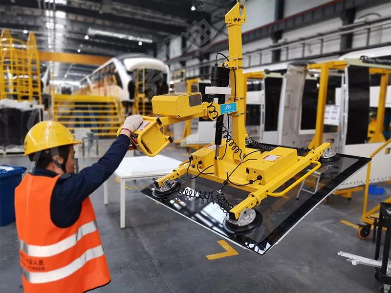 孚来迪公司提供的吸盘吊具设备,主要特点为:是利用直流蓄电池驱动,无需电缆接入,解决了施工现场电源不便的问题,可根据玻璃尺寸定做,提高产能、节省人工。中车浦镇庞巴迪PBTS一线操作人员一致反馈该产品比他们预想的效果还要好,而且操作也不复杂。
